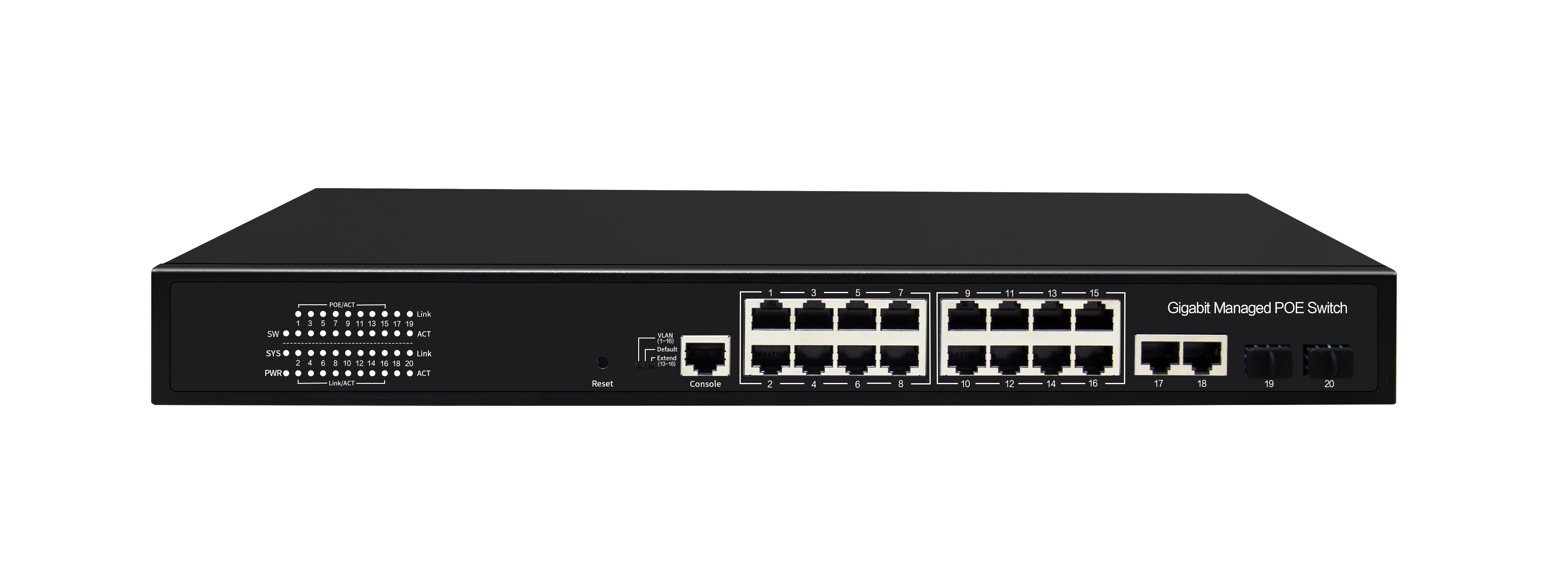 16 Gigabit PoE network ports+2 Gigabit uplink network ports+2 Gigabit SFP optical ports+1 Console port network managed commer