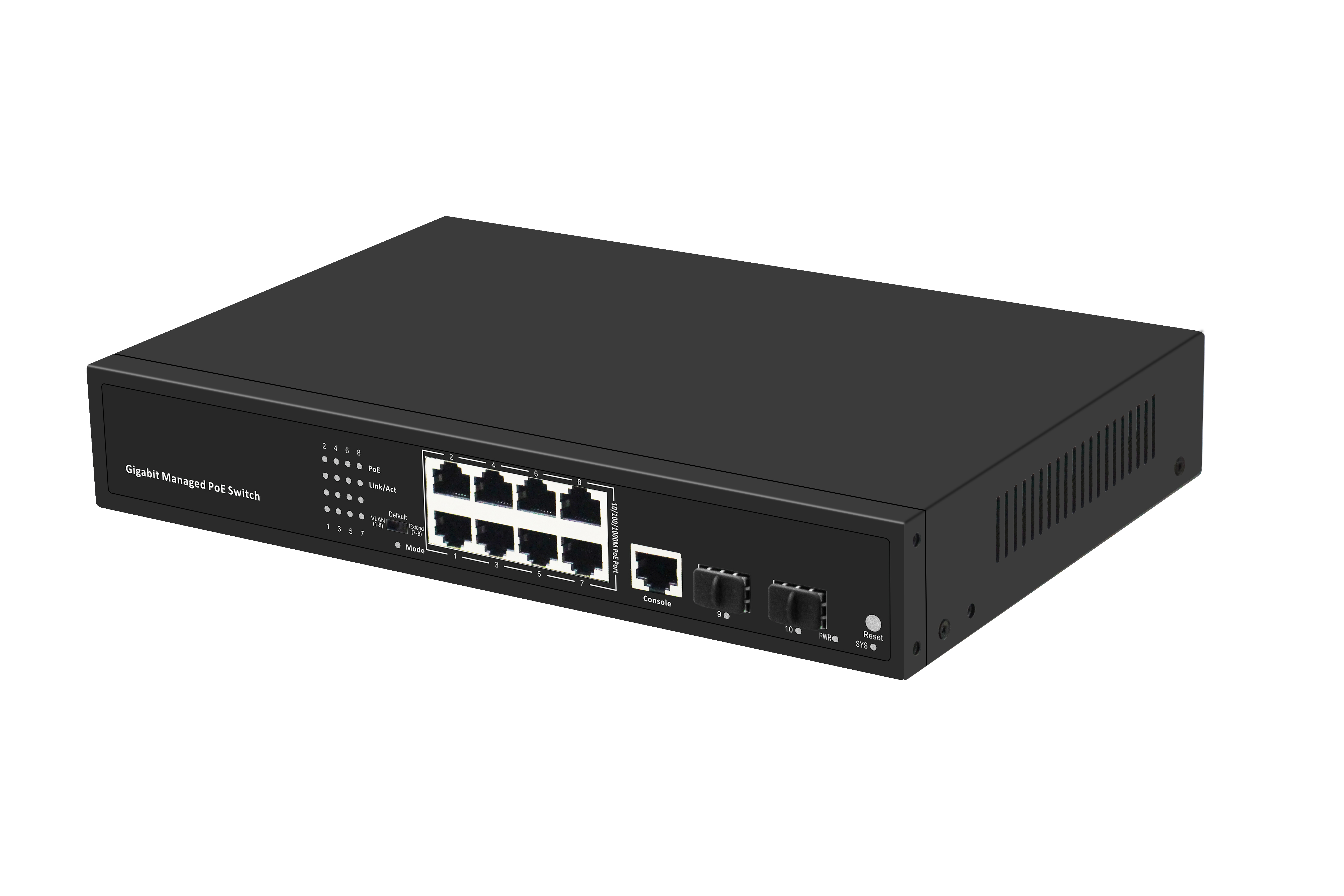 The 10 port gigabit managed Power over Ethernet switch (PoE switch) uses high-quality high-speed network IC and the most stable PoE chip. The PoE port meets the 802.3af or 802.3at standard. This series of PoE switches can provide seamless connection for 10/100/1000M Ethernet, and the PoE power supply port can automatically detect and supply power to powered devices that meet the IEEE802.3af or IEEE802.3at standard. Non PoE devices do not supply power for intelligent detection, Only transmit data.