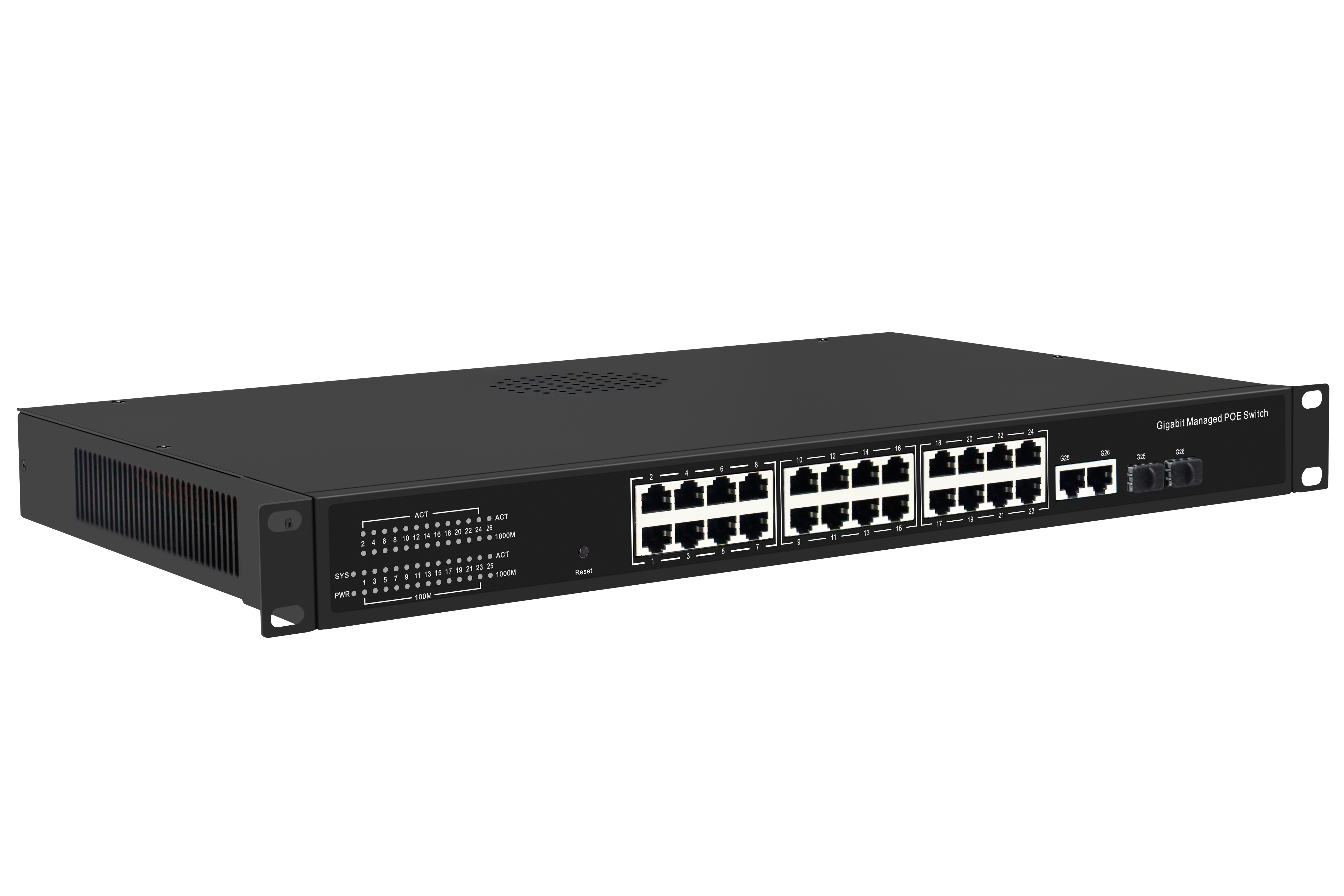 Support 24 100 Gigabit POE ports+2 Gigabit Ethernet ports+2 Gigabit SFPs (optical multiplexing)