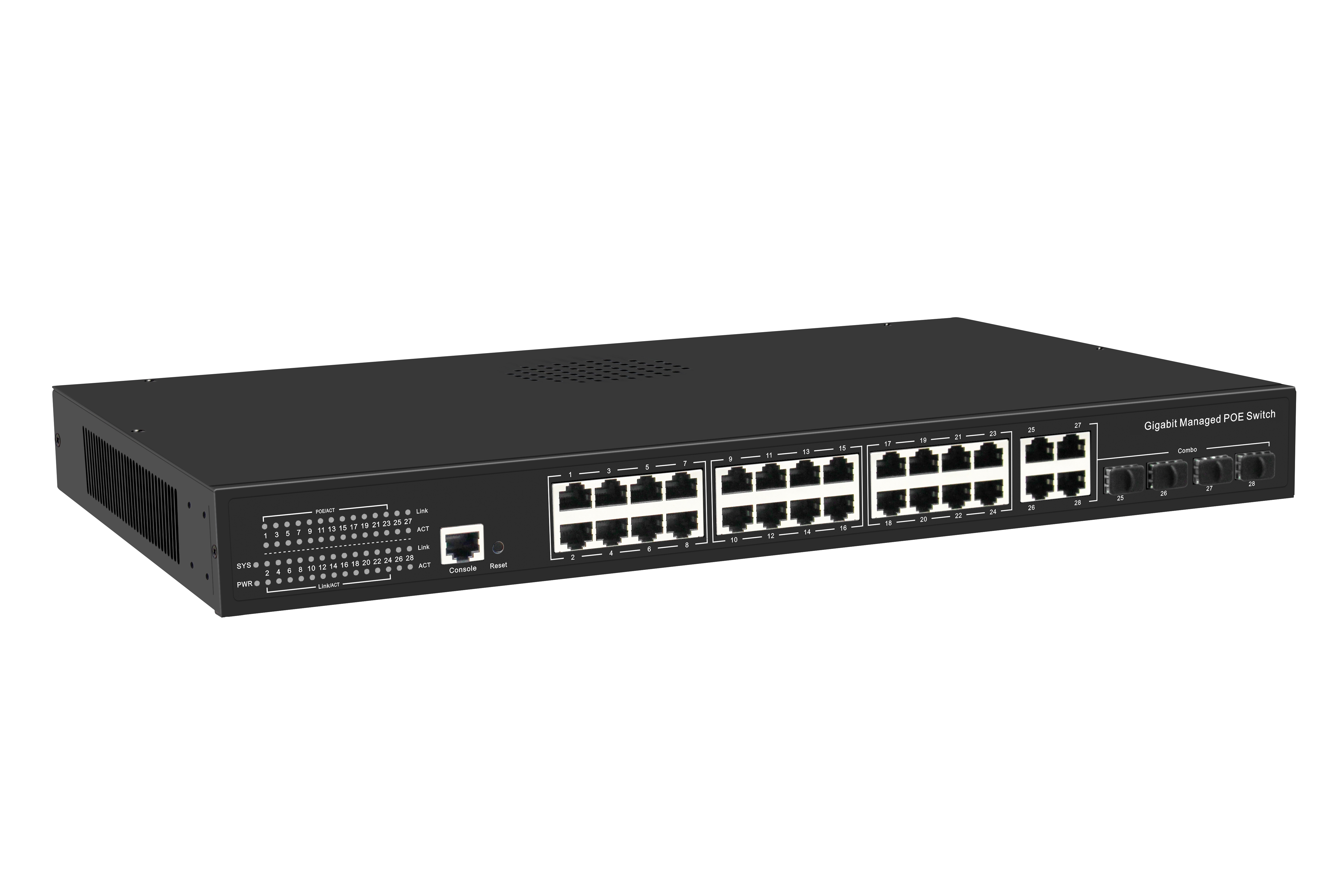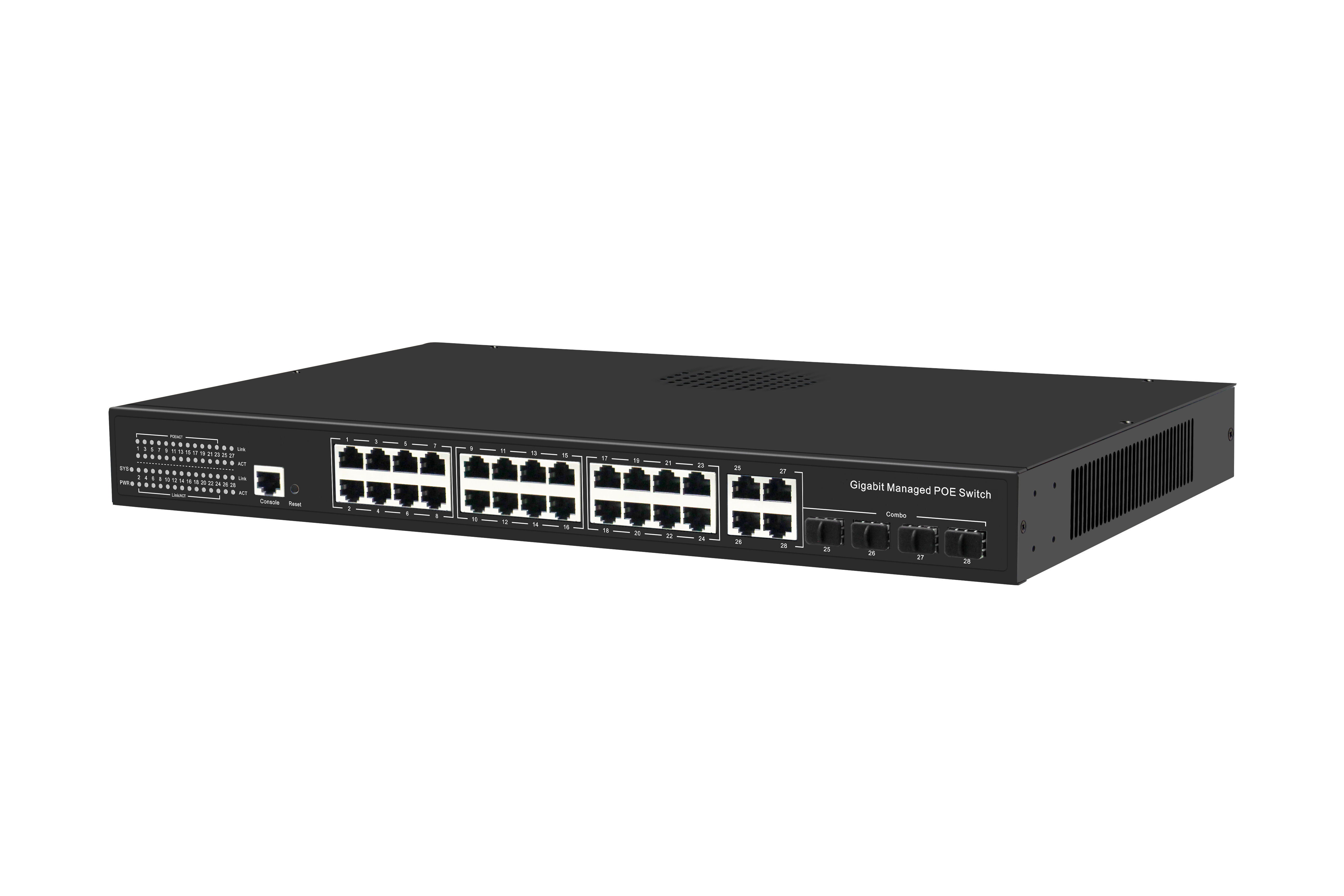 24 Gigabit PoE network ports+8 Gigabit optoelectronic multiplexing SFP ports+4 Gigabit SFP optical ports+1 Console port