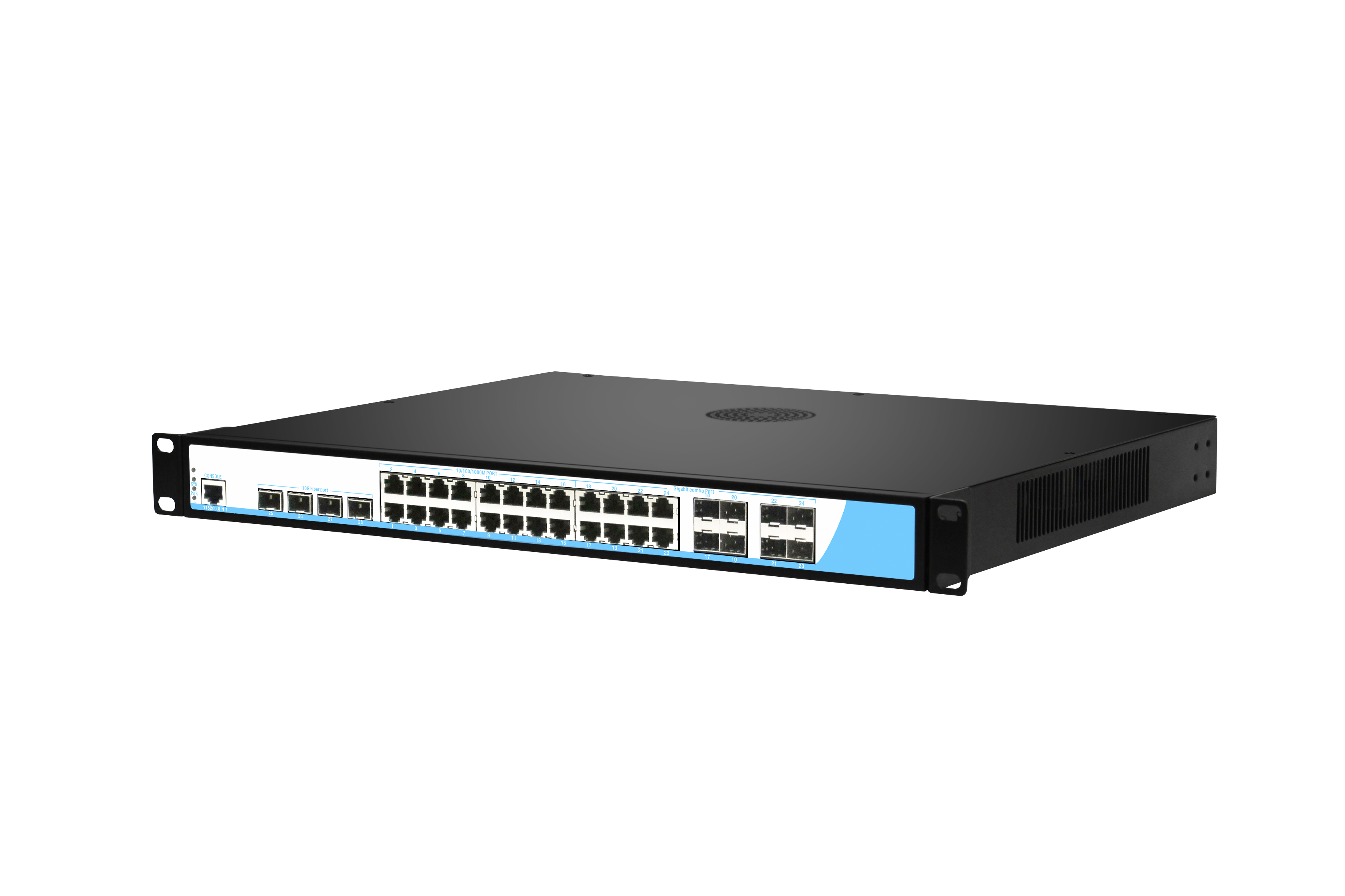36 port 10 Gigabit managed POE switch, using 10/100/1000Mbps&10G industrial grade Ethernet optoelectronic switch motherboard, based on BCM high-quality industrial grade chip, users can choose a mixed configuration of optoelectronic ports at will. The access fiber medium adopts modular design, providing 24 10/100/1000 self adapting electrical ports (+POE), 8 multiplexed gigabit SFP optical ports/electrical ports, and 4 integrated 10G optical ports, providing sufficient bandwidth for aggregation and core data exchange; Provide high capacity switching capability and support ACL functionality based on three or four layers.